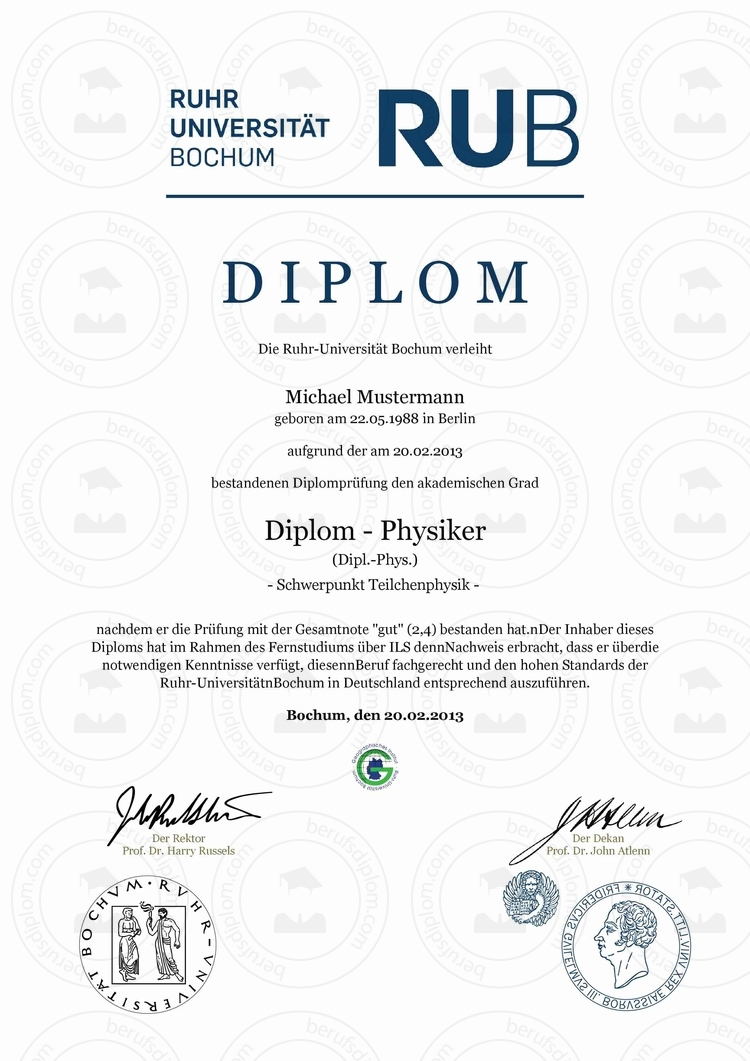 Diplom Urkunde von Ruhr-Universität Bochum einfach online kaufen ► Diplom mit individuell frei wählbaren Fachrichtung und Schwerpunkt ► Diplom ohne Studium ► Reproduktion nach aktueller Vorlage Ruhr University Bochum