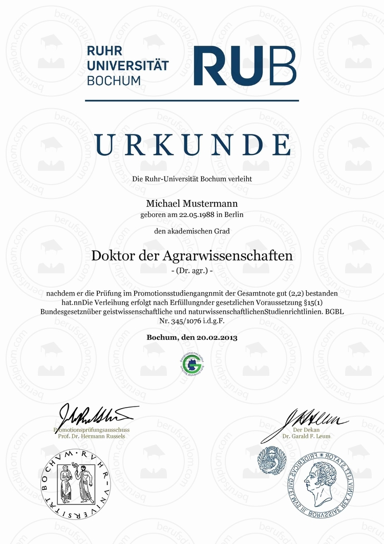 Doktortitel von Ruhr-Universität Bochum kaufen oder Professor werden ohne zu promovieren? ► Reproduktion einer Promotionsurkunde mit individuellem Habilitation ► Doktortitel kaufen (Bochum) Ruhr University Bochum