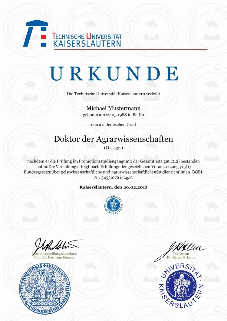 Doktortitel von Technische Universität Kaiserslautern kaufen oder Professor werden ohne zu promovieren? ► Reproduktion einer Promotionsurkunde mit individuellem Habilitation ► Doktortitel kaufen (Kaiserslautern) Technische Universität Kaiserslautern