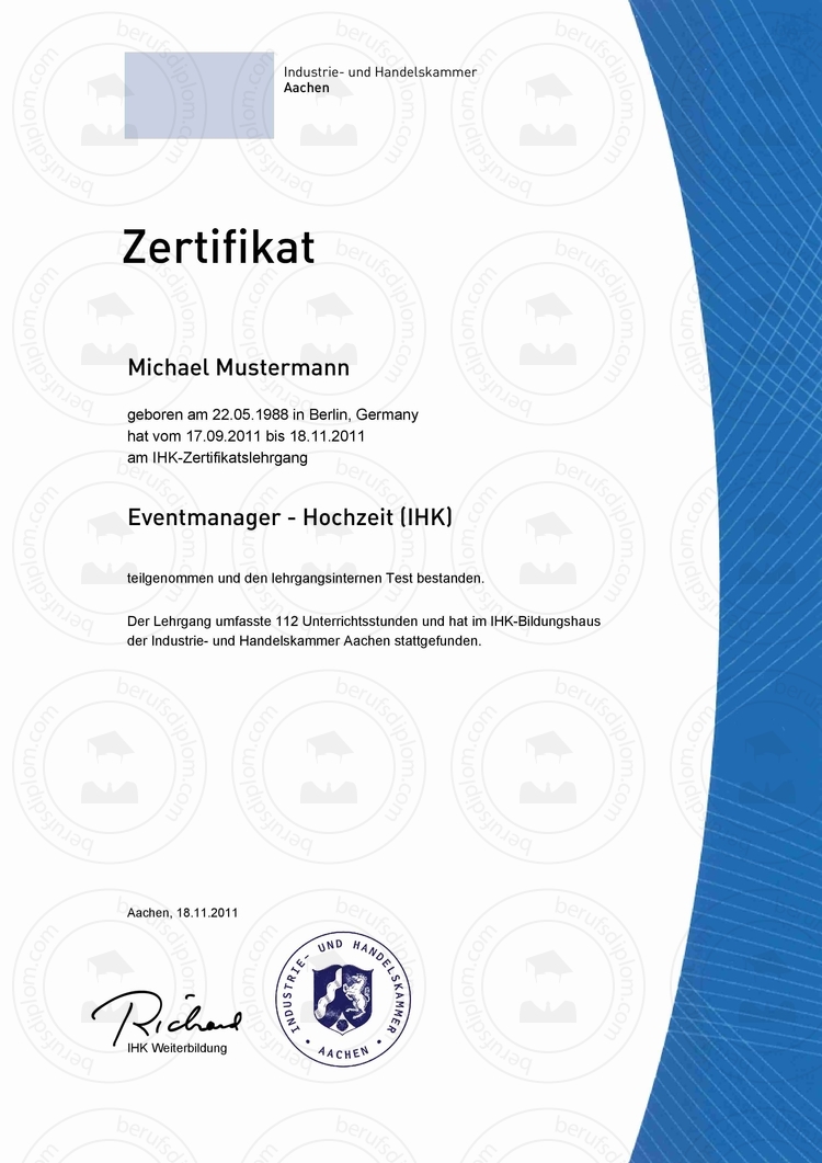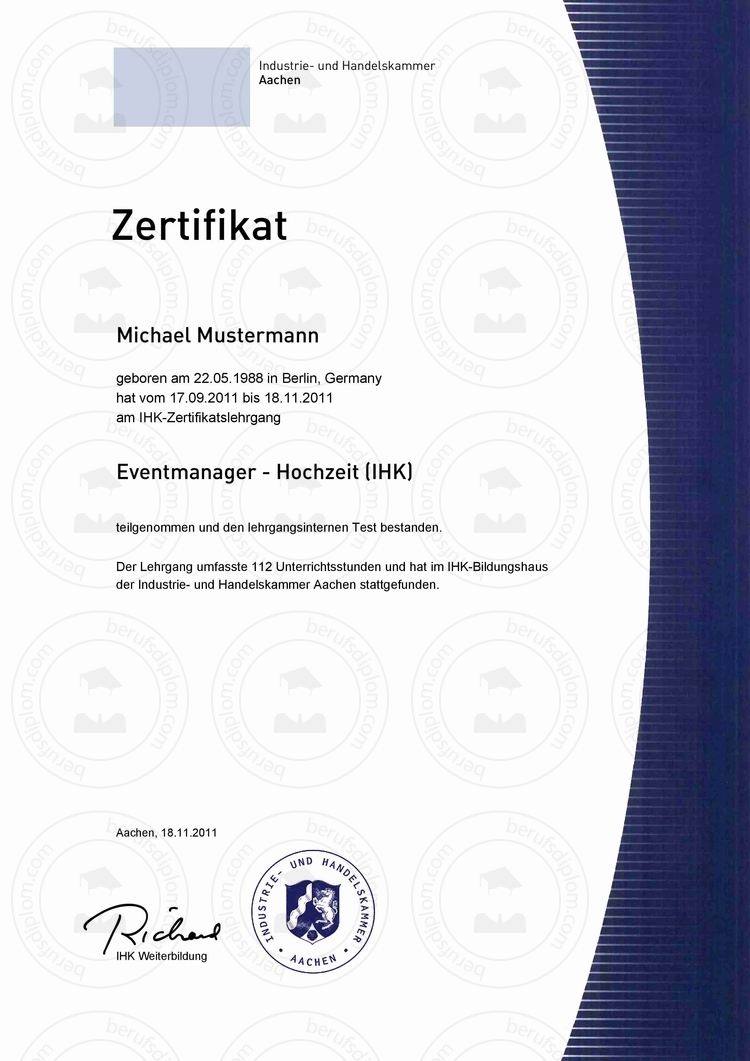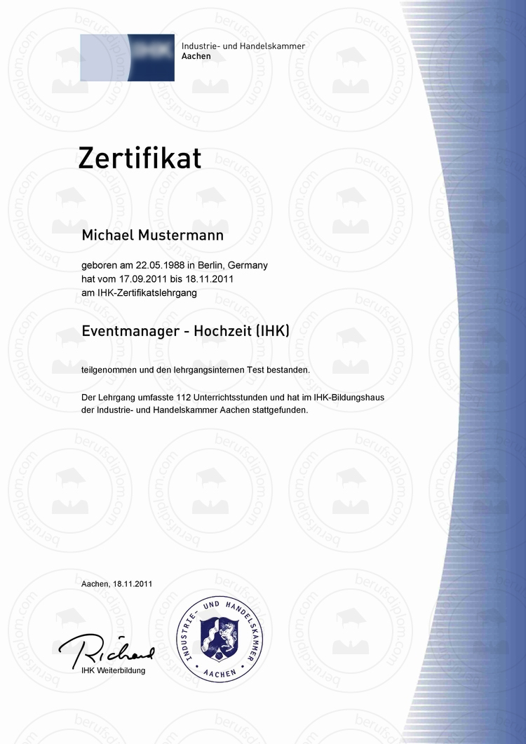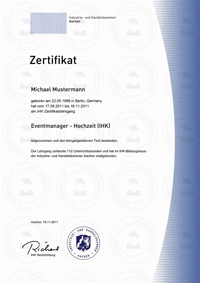 - IHK Zertifikat & Teilnahmebestätigung (Lehrgang oder Seminar) zur Reproduktion nach aktueller Vorlage.