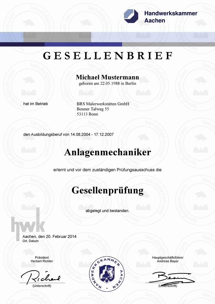 Der gekaufte Gesellenbrief wird NICHT als Muster gekennzeichnet! NUR das kostenlose Gesellenbrief Muster ist als Entwurf deklariert.