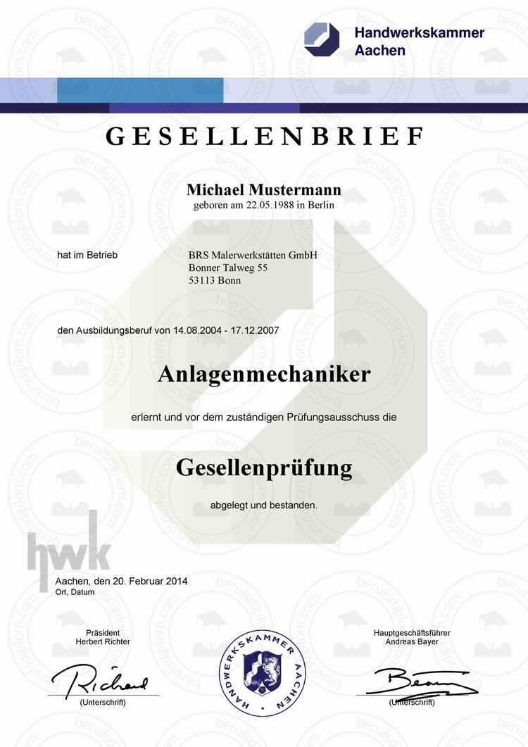 Der gekaufte Gesellenbrief wird NICHT als Muster gekennzeichnet! NUR das kostenlose Gesellenbrief Muster ist als Entwurf deklariert.