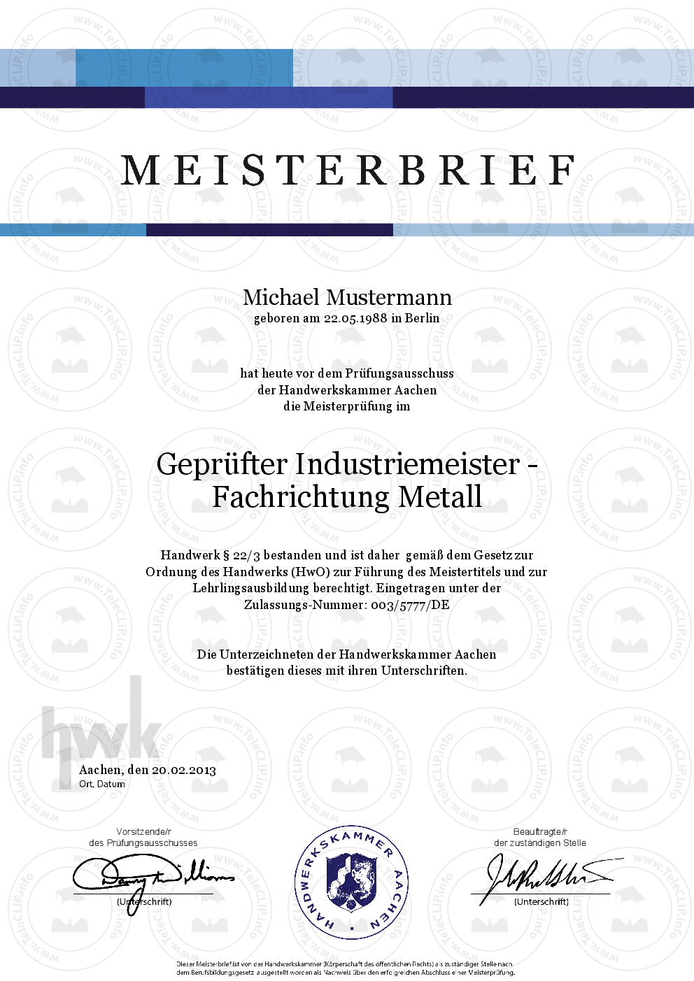 Das passende HWK Meisterprüfungszeugnis gibt es HIER: