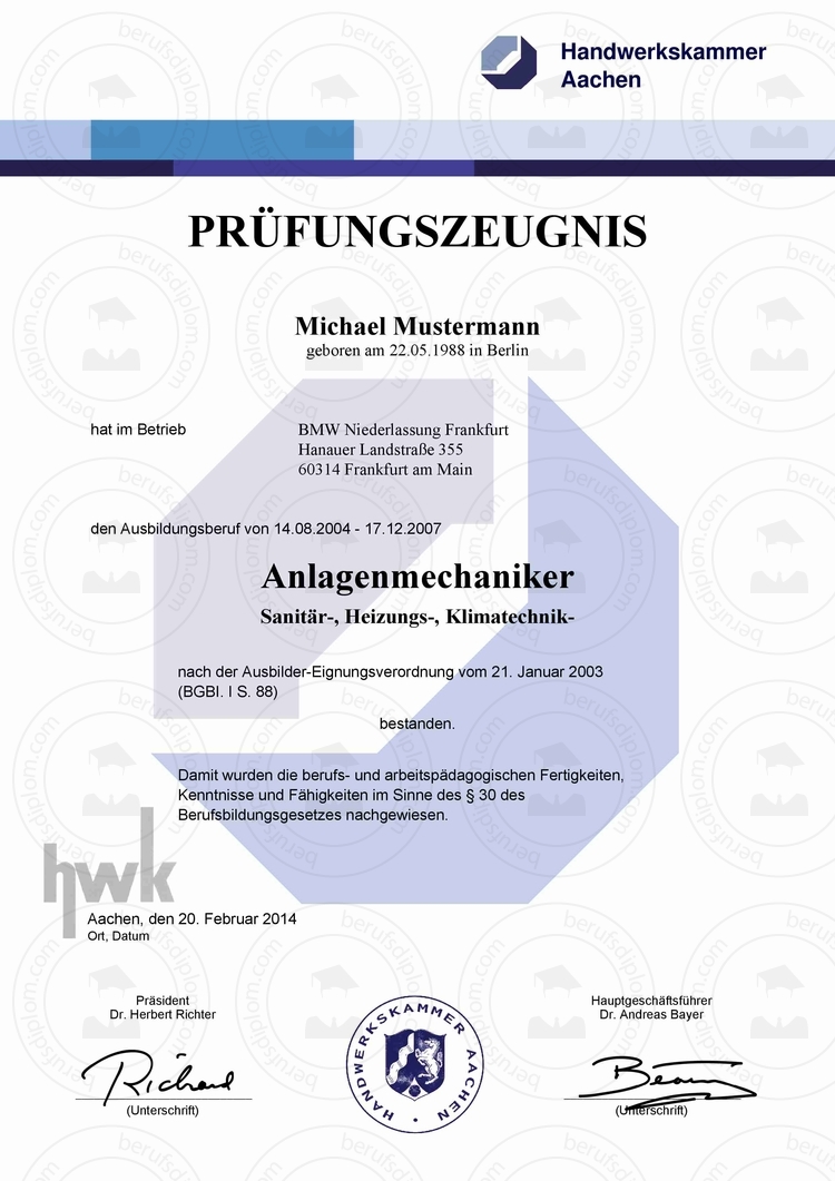 Das gekaufte HWK Prüfungszeugnis wird NICHT als Muster gekennzeichnet! NUR das kostenlose HWK Prüfungszeugnis Muster ist als Entwurf deklariert.