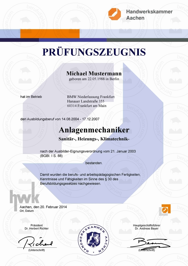 • Deutsches HWK Prüfungszeugnis für anerkannte Ausbildungsberufe im Handwerk (Reproduktion nach originaler Vorlage)