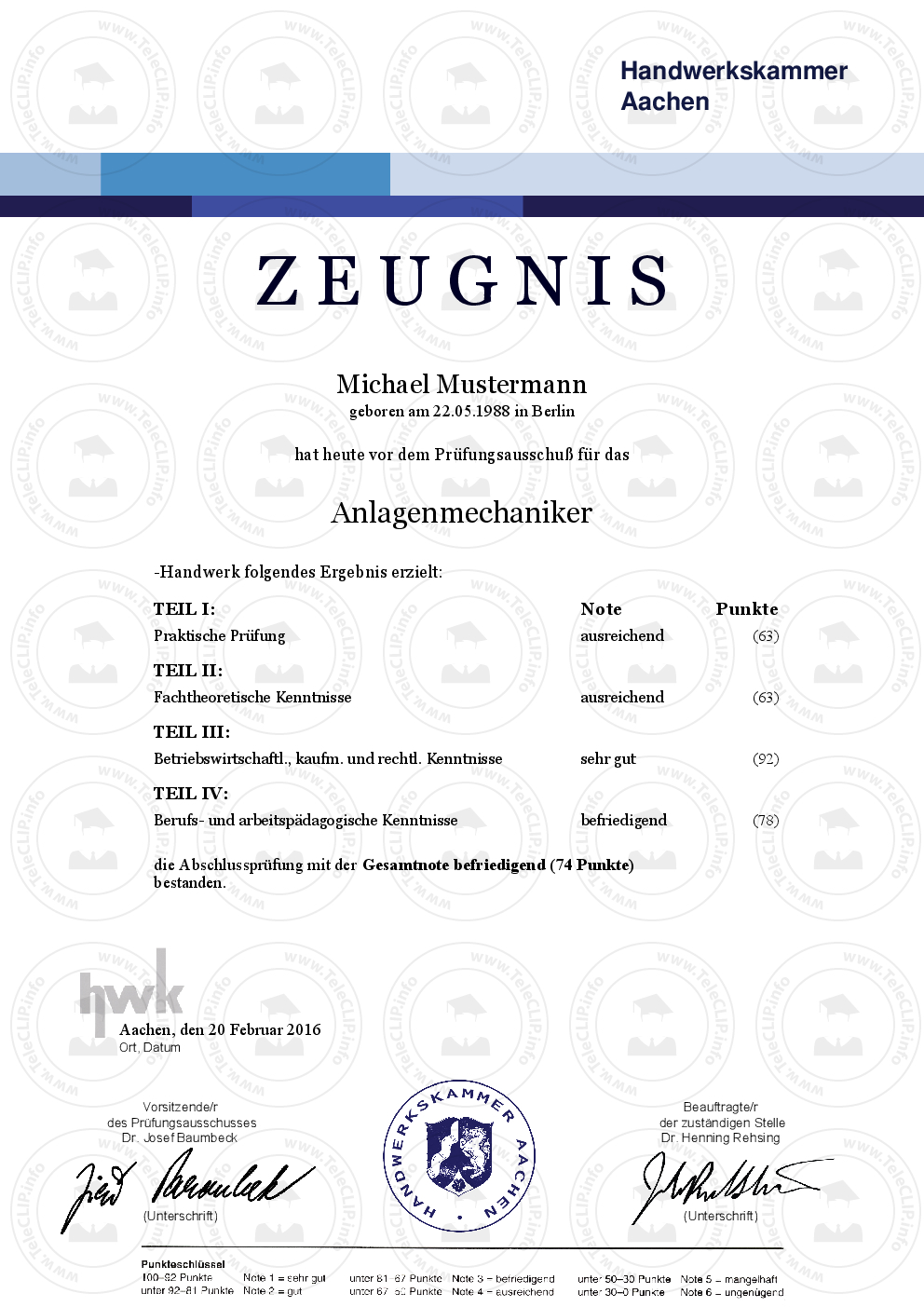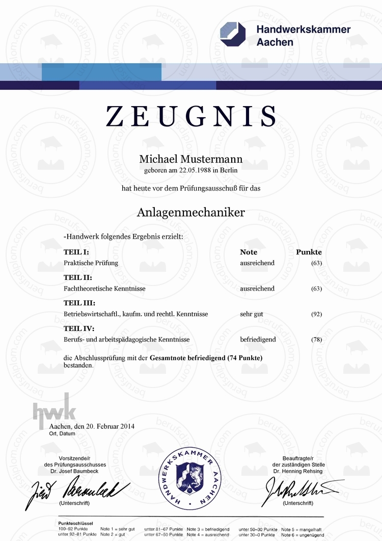 HWK Zeugnis ► Aktuelles HWK Zeugnis (Deutschland) ► Reproduktion nach aktueller Vorlage