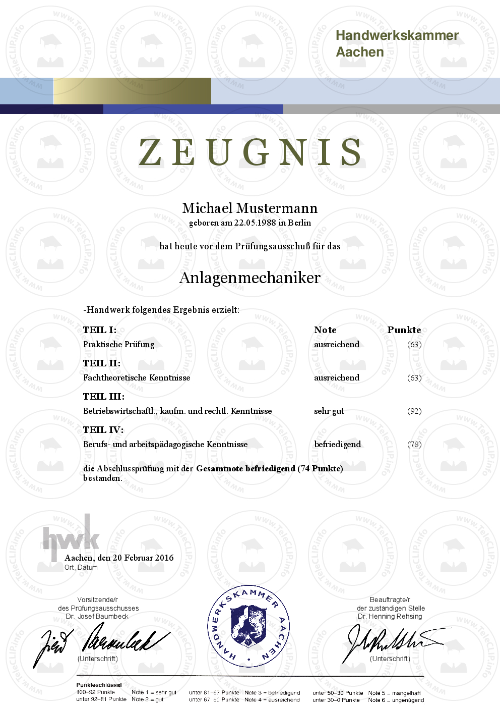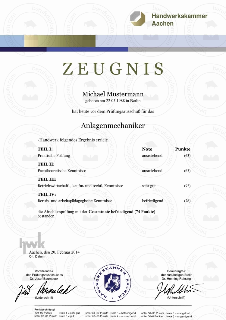 HWK Zeugnis ► Aktuelles HWK Zeugnis (Deutschland) ► Reproduktion nach aktueller Vorlage