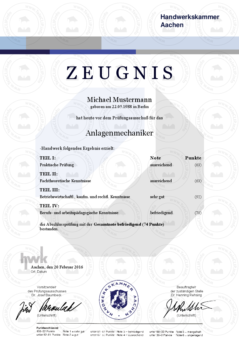HWK Zeugnis ► Aktuelles HWK Zeugnis (Deutschland) ► Reproduktion nach aktueller Vorlage