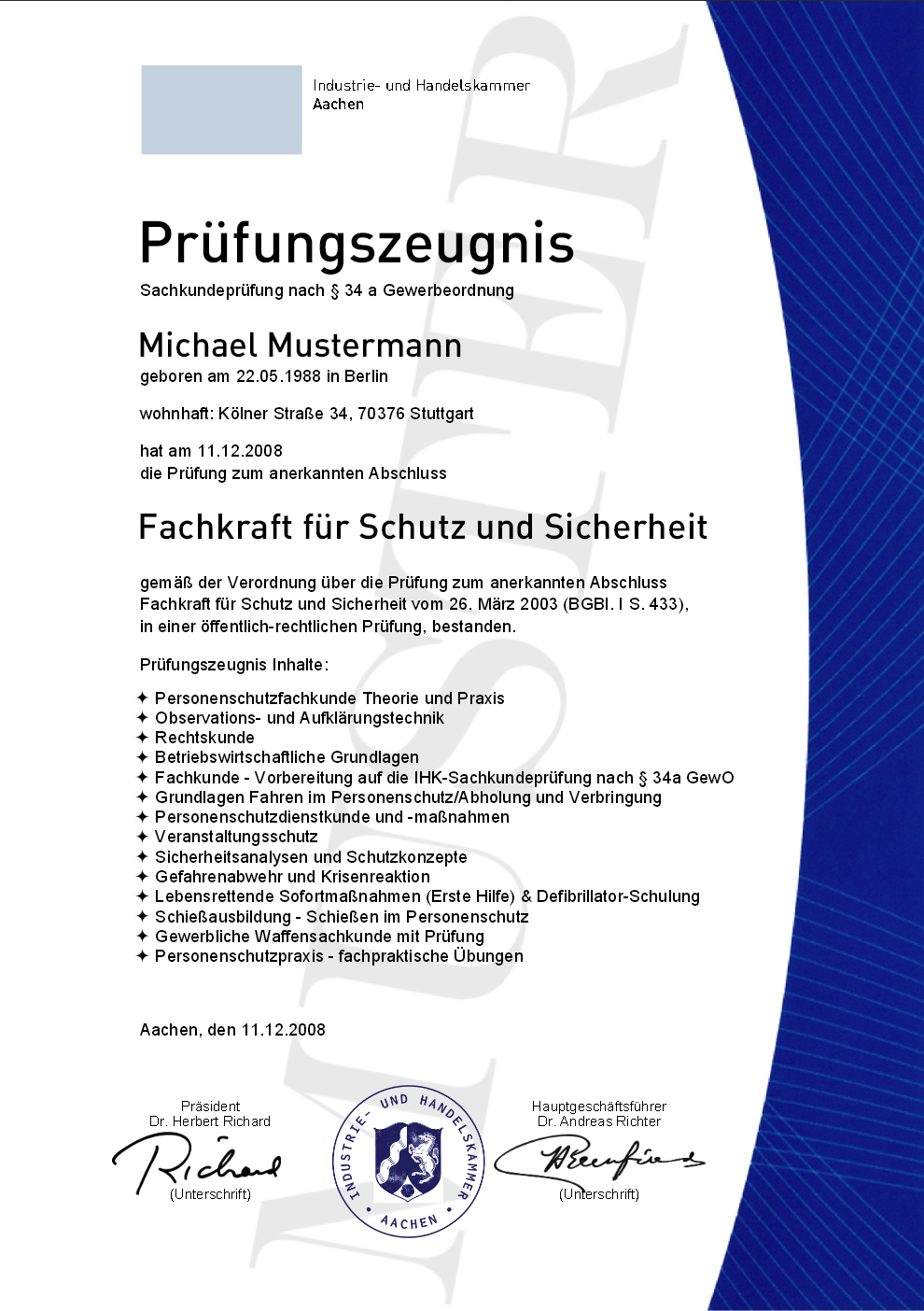 Sachkundeprüfung ► IHK Kommandoführer Personenschutz ► Fachkraft für Schutz- und Sicherheit, Personenschutzfachkraft, Geprüfte Schutz- und Sicherheitskraft, Kommandoführer Personenschutz ► Reproduktion nach aktueller Vorlage