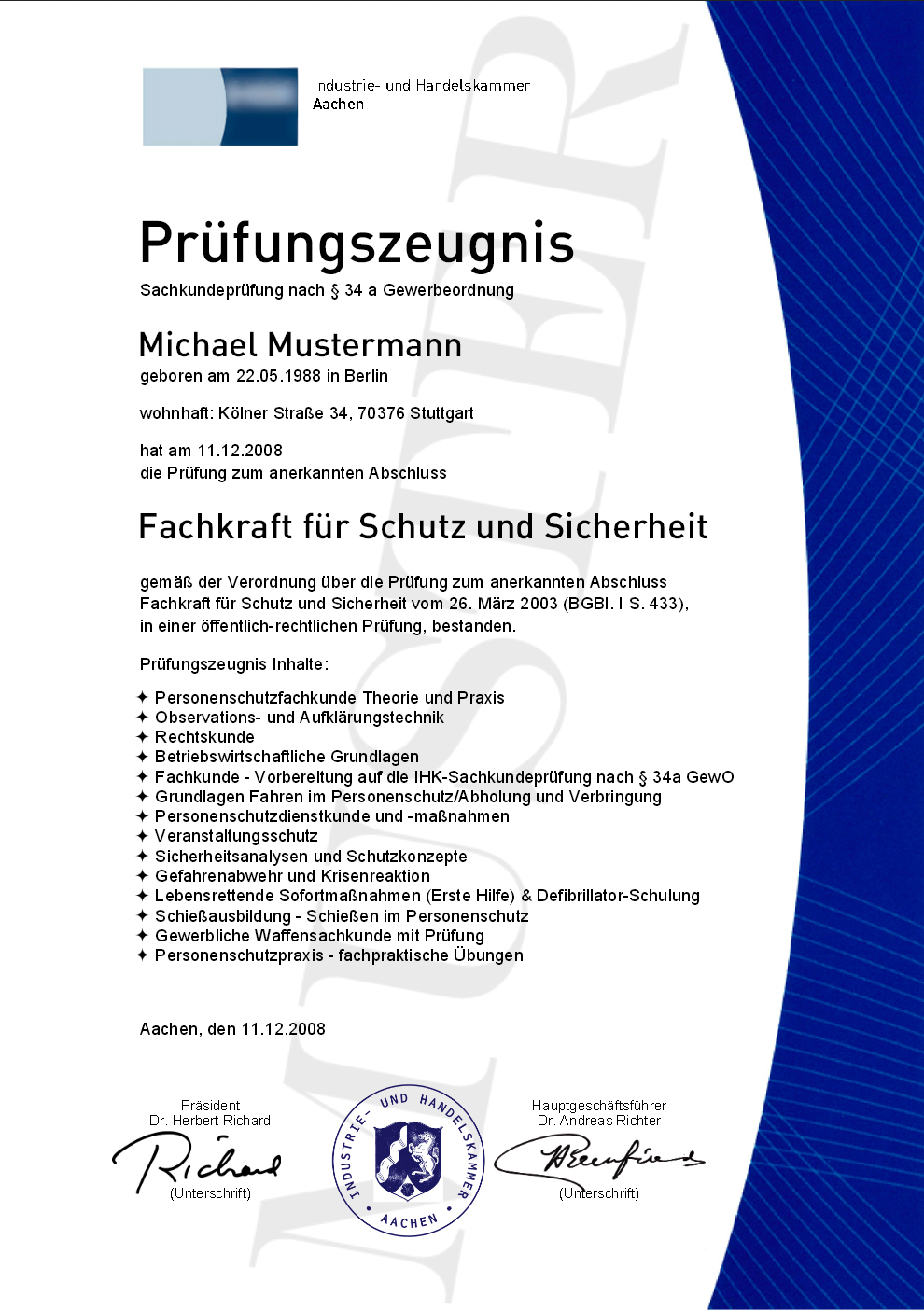 • IHK Kommandoführer Personenschutz über die erfolgreiche Ablegung einer Sachkundeprüfung / Unterrichtung nach § 34a zur Reproduktion nach aktueller Vorlage.