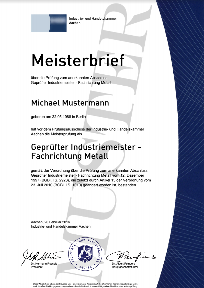• Deutscher IHK Meisterbrief (Reproduktion nach originaler:) Vorlage ab 2007)