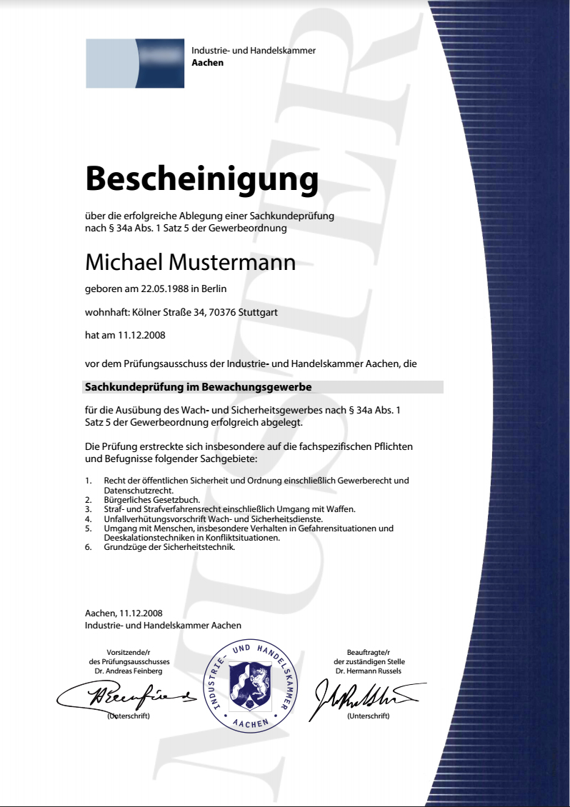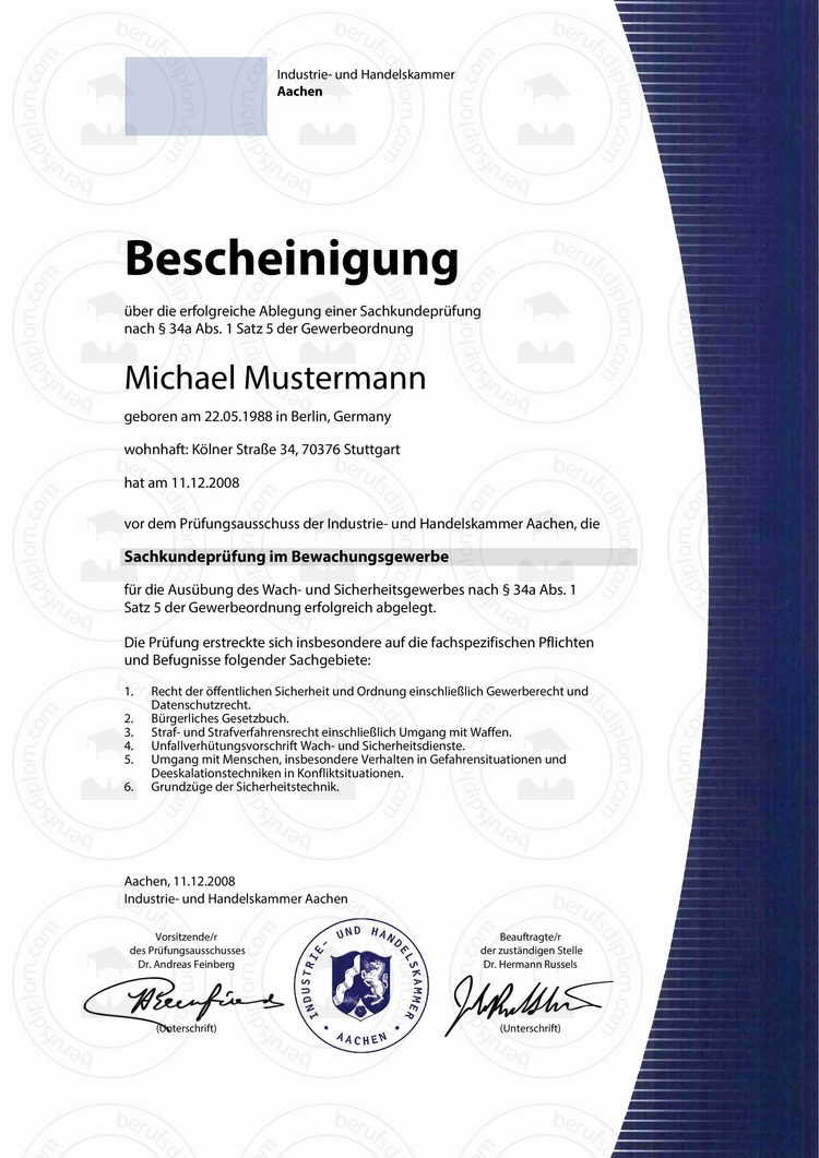 • IHK Sachkundebescheinigung über die erfolgreiche Ablegung einer Sachkundeprüfung / Unterrichtung nach § 34a zur Reproduktion nach aktueller Vorlage.