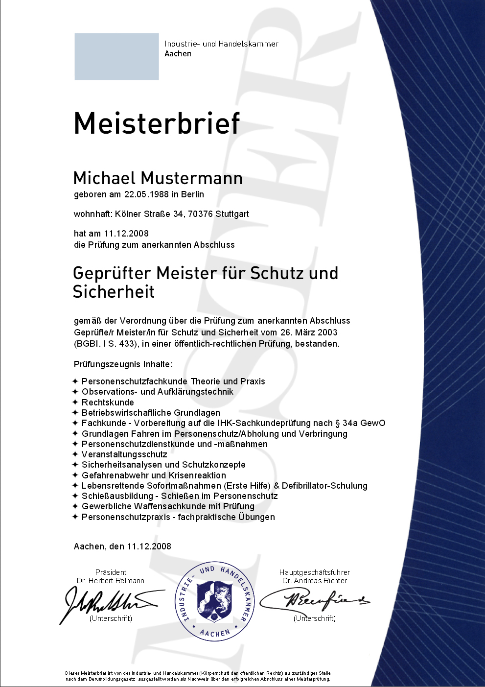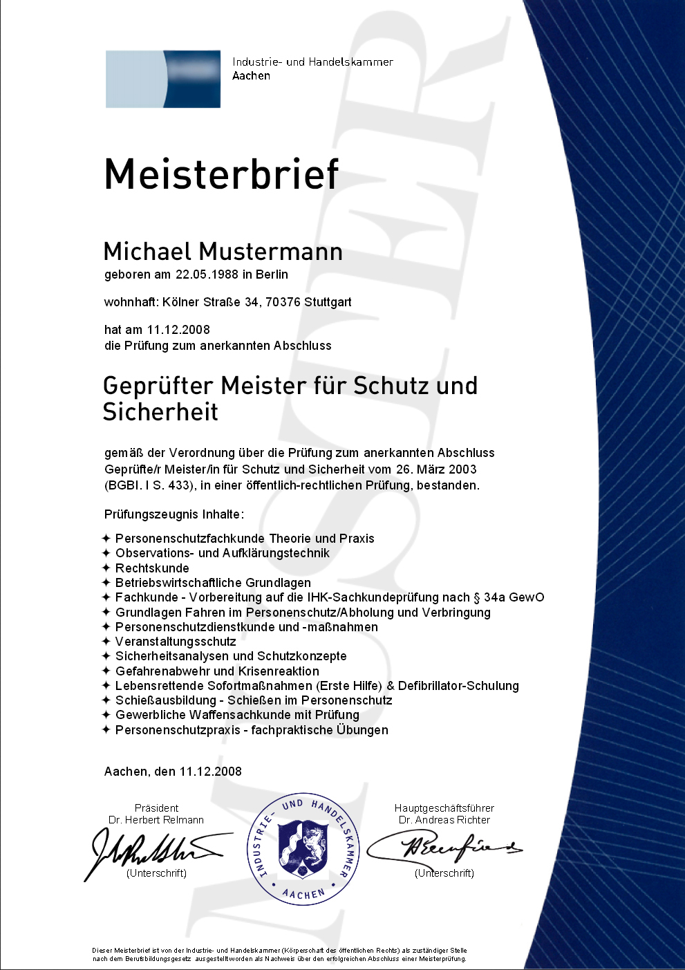 - IHK Geprüfter Meister für Schutz und Sicherheit über die erfolgreiche Ablegung einer Sachkundeprüfung / Unterrichtung nach § 34a zur Reproduktion nach aktueller Vorlage.