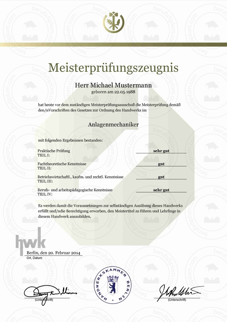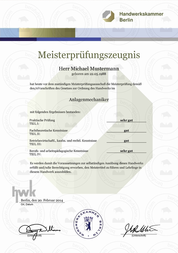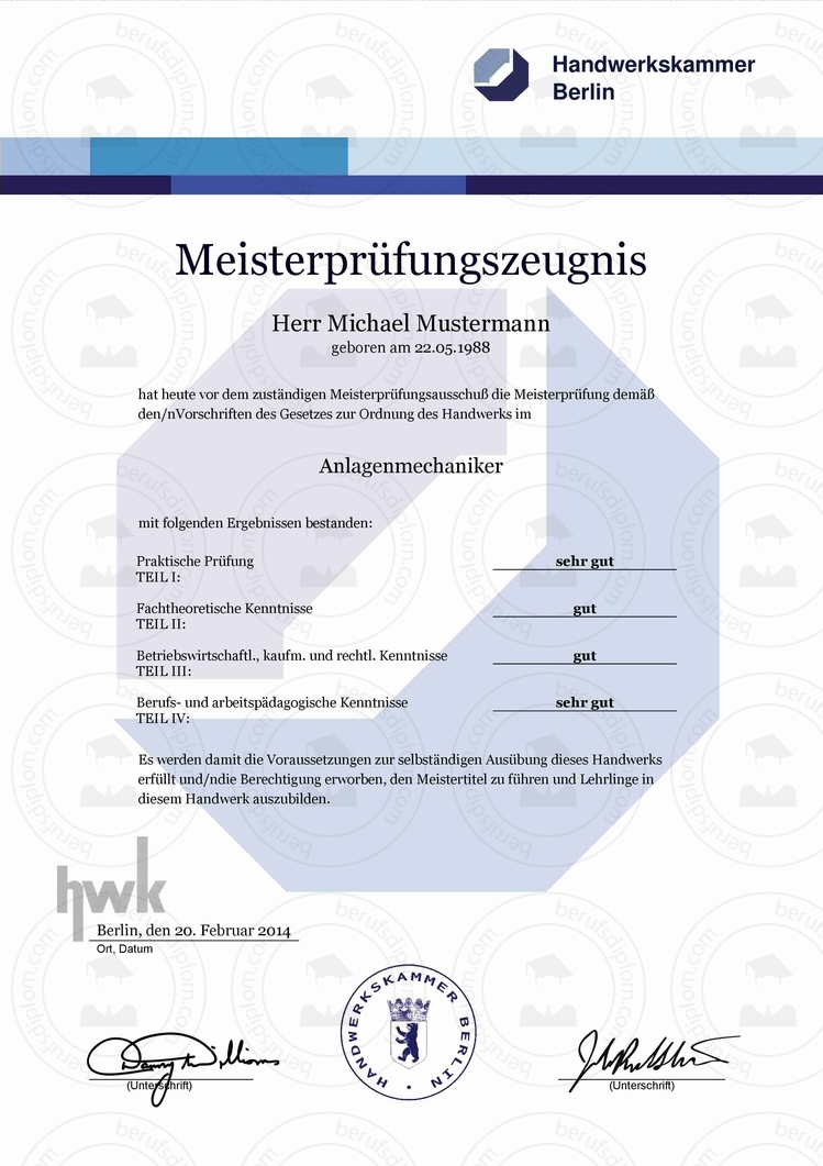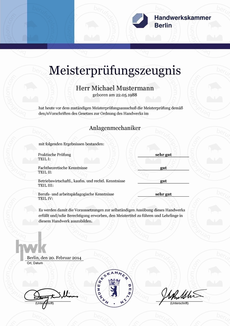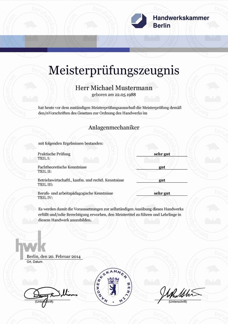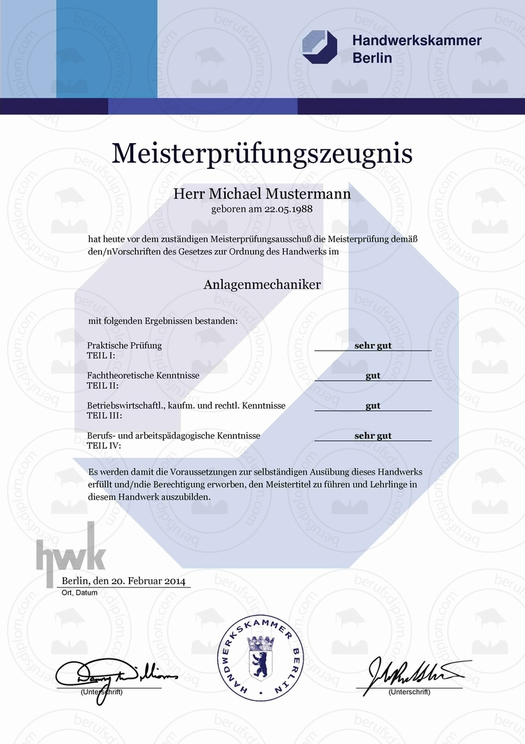 HWK Meisterprüfungszeugnis kaufen | In nur zwei Minuten als hochauflösendes PDF zum Download und Ausdrucken