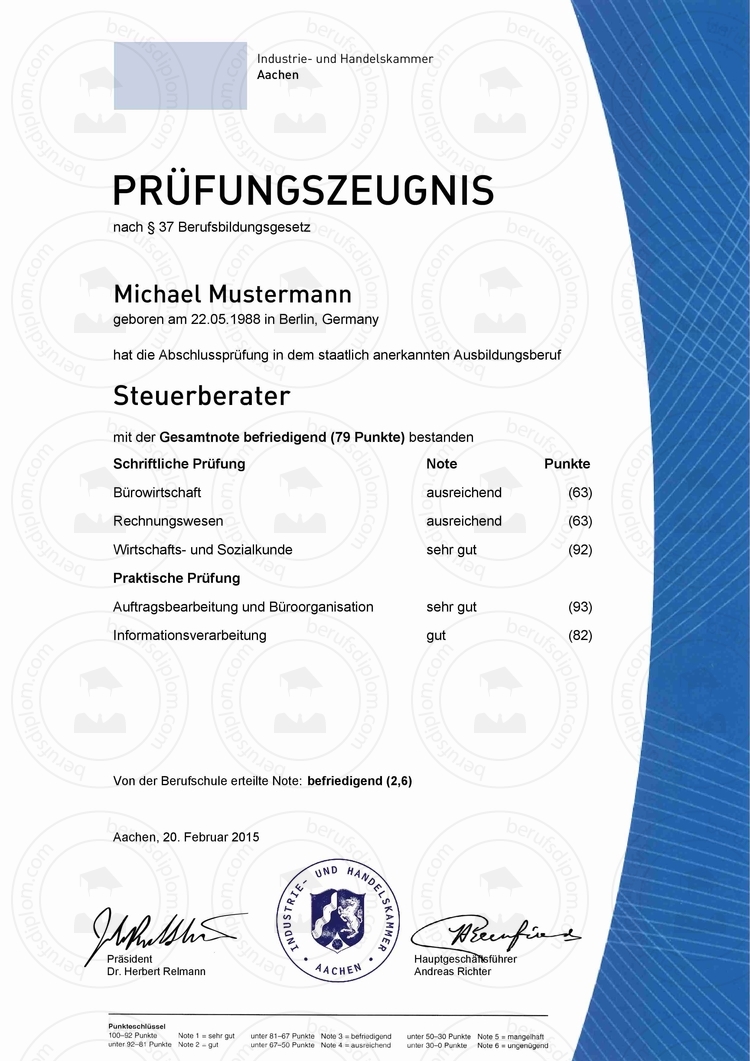 - Aktuelles IHK Prüfungszeugnis für den anerkannten Ausbildungsberuf in Deutschland (Reproduktion nach aktueller Vorlage)