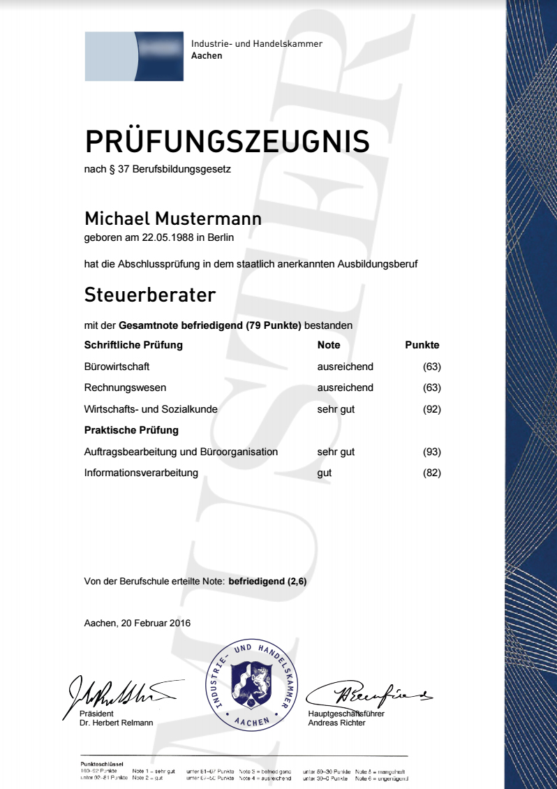 Prüfungszeugnis ► Aktuelles IHK Prüfungszeugnis (Deutschland) ► Reproduktion nach aktueller Vorlage