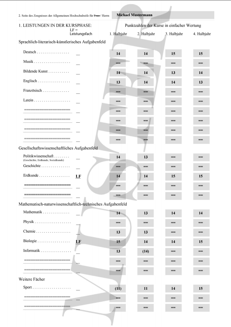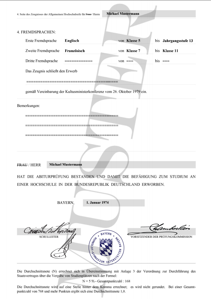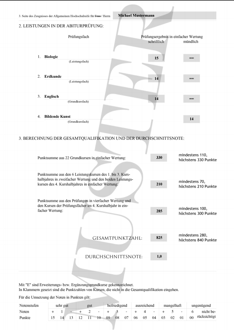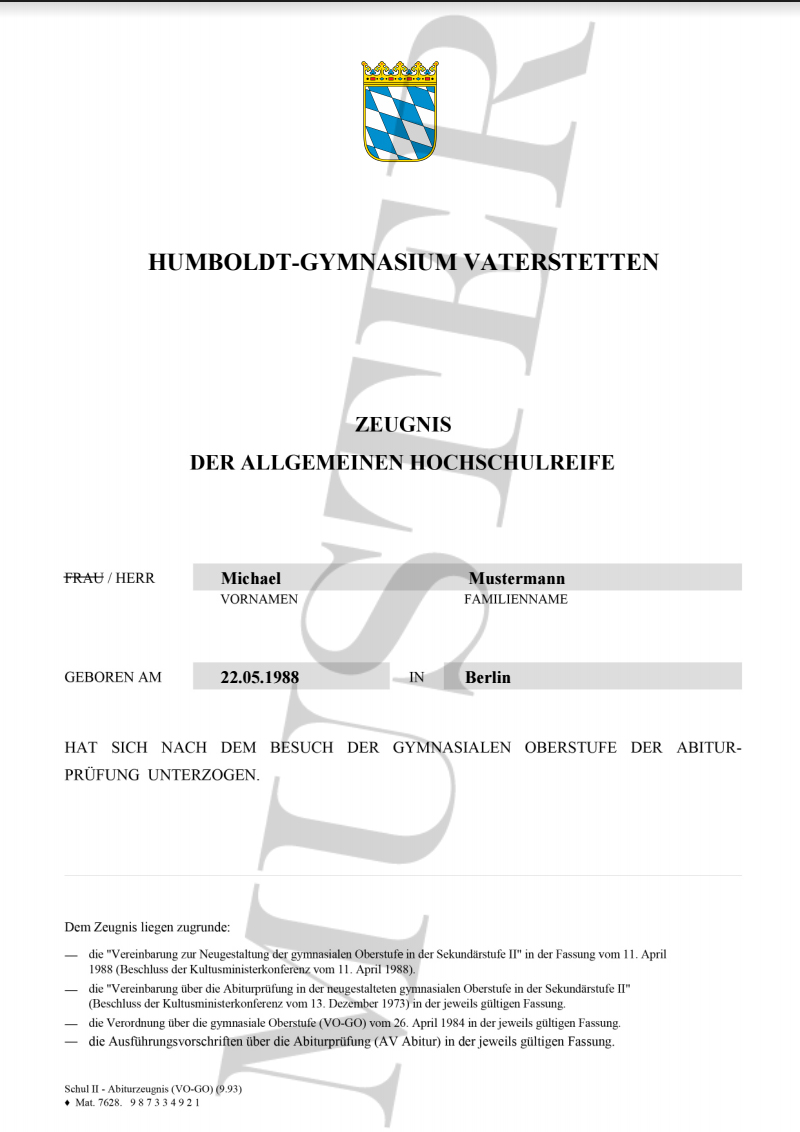 Das gekaufte Abitur wird NICHT als Muster gekennzeichnet! NUR das kostenlose Abiturzeugnis Muster ist als Entwurf deklariert.