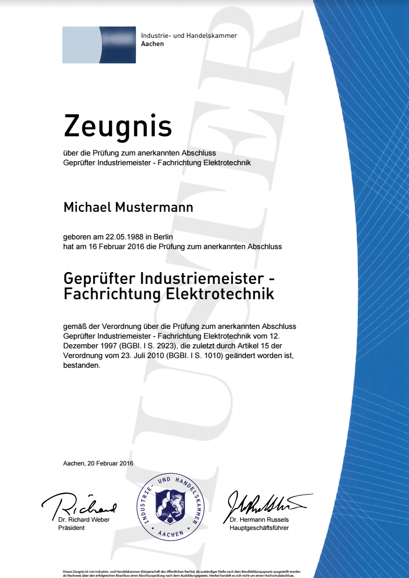 Zeugnis ► Aktuelles IHK Zeugnis zum Fortbildungsberuf (Deutschland) ► Reproduktion nach aktueller Vorlage