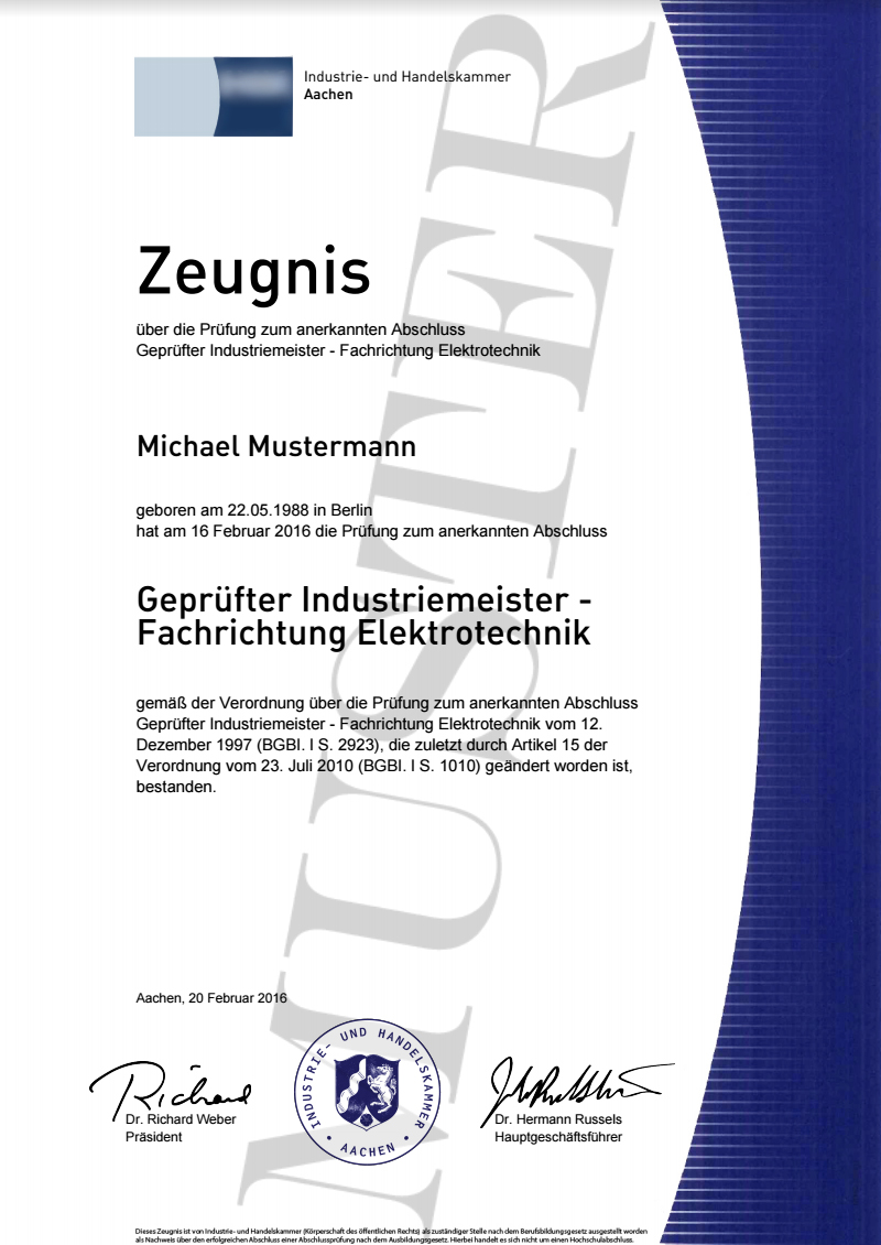 (z. B. Geprüfter Industriemeister/-in Elektrotechnik)