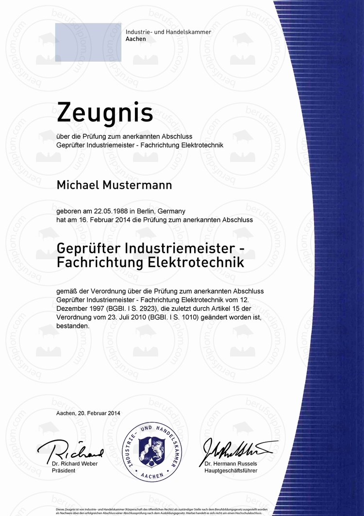 • Aktuelles IHK Zeugnis für den Fortbildungsberuf in Deutschland (Reproduktion nach aktueller Vorlage)