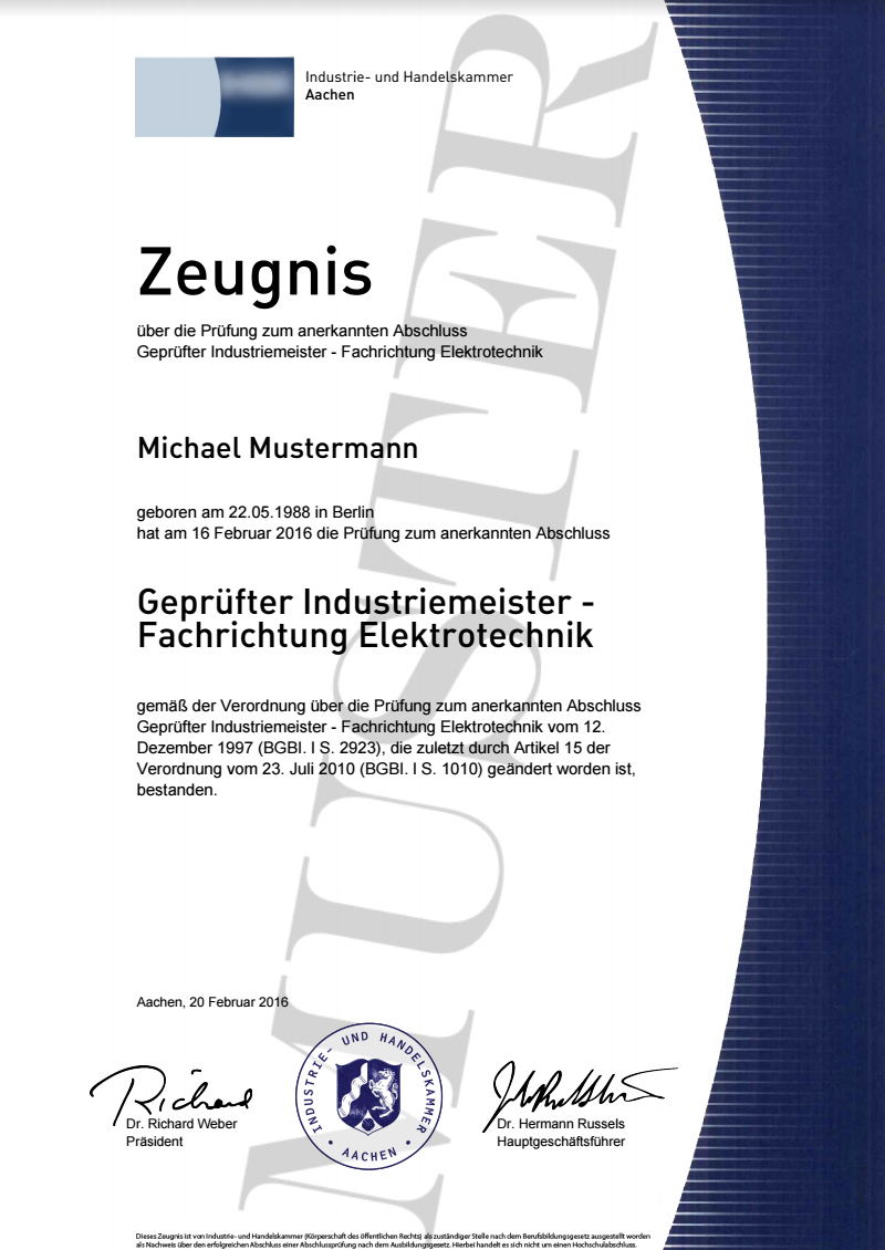 Zeugnis ► Aktuelles IHK Zeugnis zum Fortbildungsberuf (Deutschland) ► Reproduktion nach aktueller Vorlage