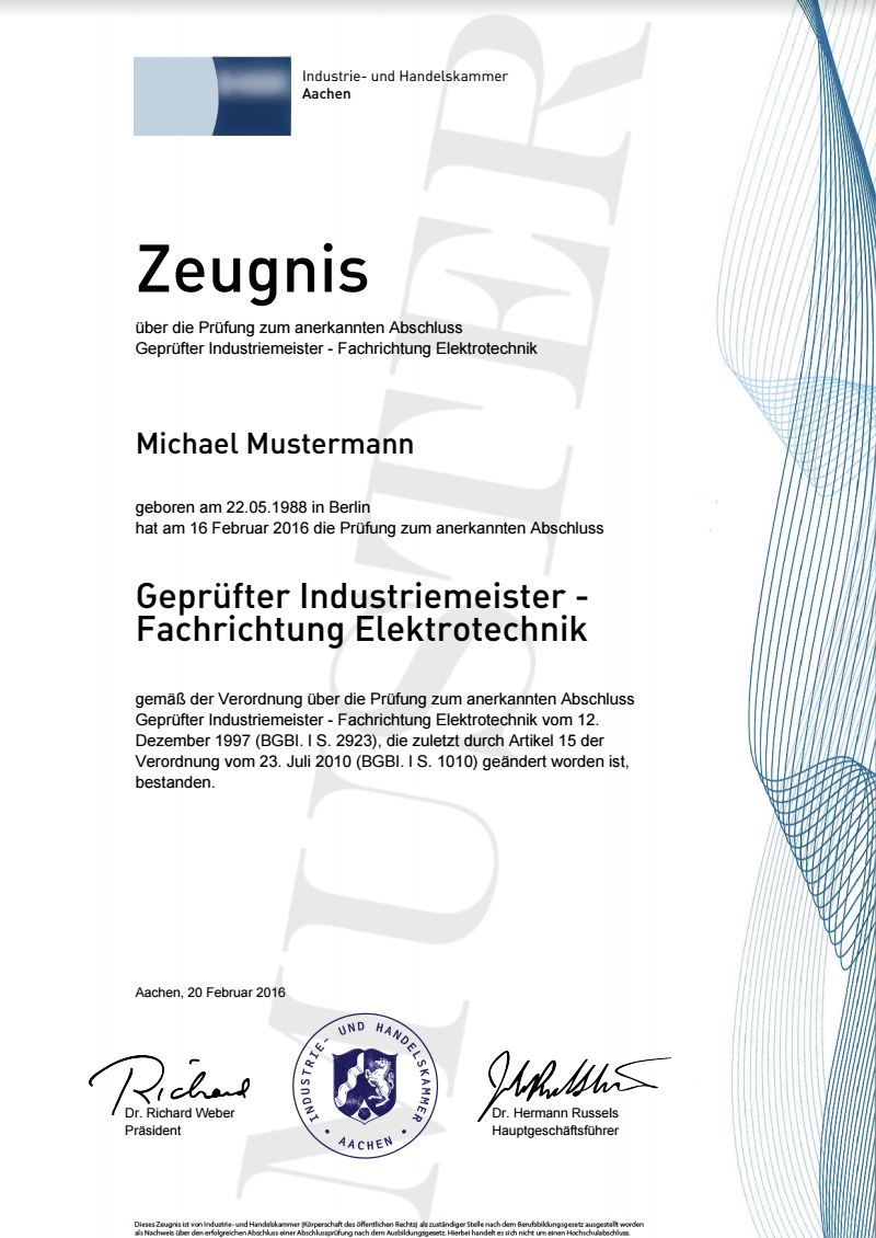 Zeugnis ► Aktuelles IHK Zeugnis zum Fortbildungsberuf (Deutschland) ► Reproduktion nach aktueller Vorlage