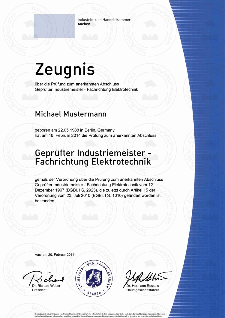 • Aktuelles IHK Zeugnis für den Fortbildungsberuf in Deutschland (Reproduktion nach aktueller Vorlage)