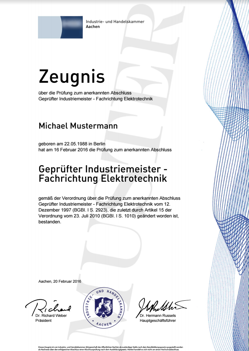 Zeugnis ► Aktuelles IHK Zeugnis zum Fortbildungsberuf (Deutschland) ► Reproduktion nach aktueller Vorlage